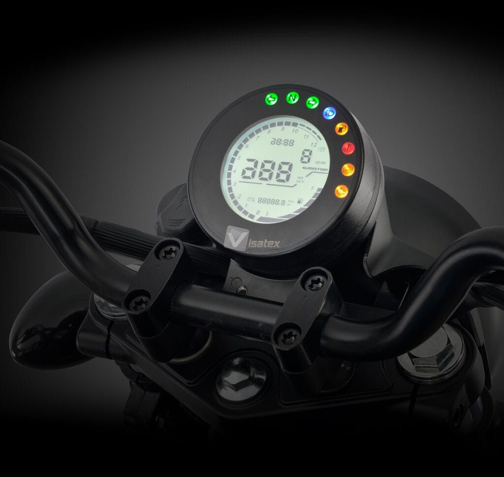 Przejrzysty, nowoczesny wyświetlacz LCD umieszczony na kierownicy SRV 125 wyświetla aktualną prędkość, obroty, przebieg, poziom paliwa oraz wskaźnik włączonego biegu, zapewniając łatwy dostęp do istotnych informacji podczas jazdy.