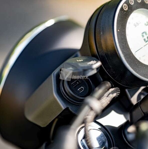 Obecność gniazd USB-A i USB-C umożliwia ładowanie telefonu komórkowego oraz podłączenie systemu nawigacyjnego bezpośrednio z kierownicy. Dodatkowo, gniazda są wyposażone w wodoodporną gumową osłonę, zapewniając ochronę przed warunkami atmosferycznymi.