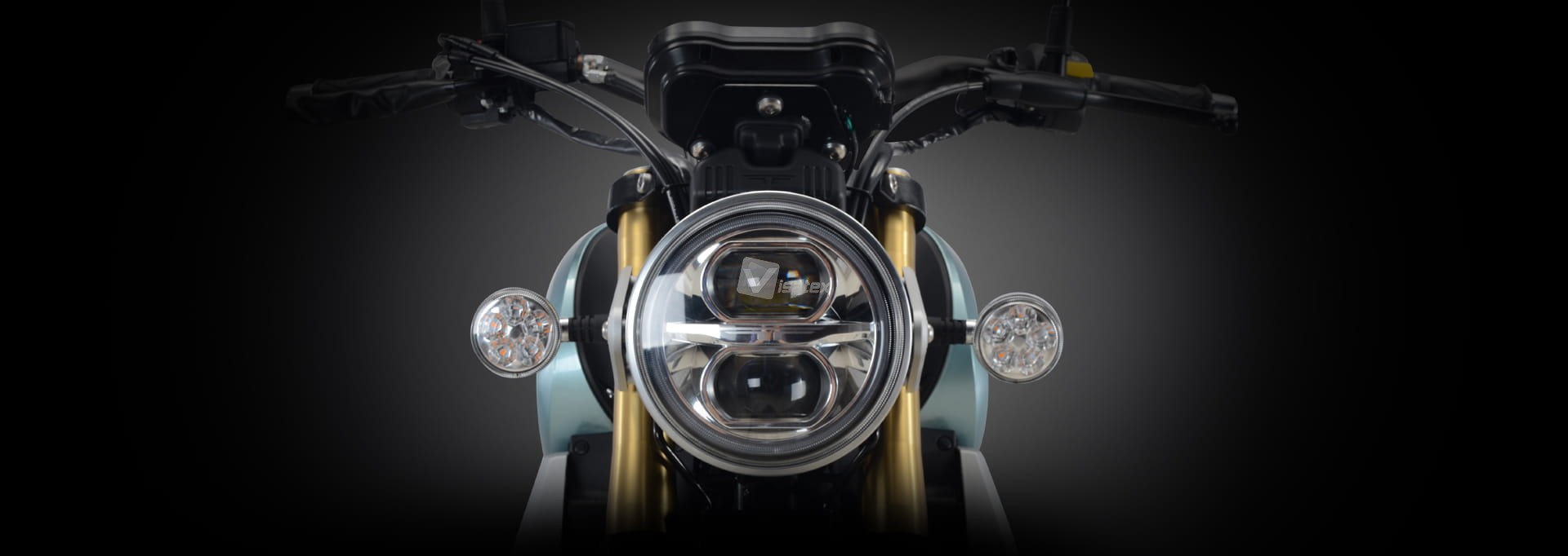 - Lampa przednia LED: Okrągła lampa przednia w stylu retro jest wykonana w technologii LED, zapewniając doskonałe oświetlenie drogi oraz charakterystyczny wygląd.