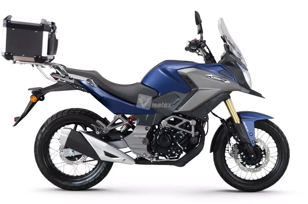 - Kompletem aluminiowych kufrów (centralny: 38 l + boczne: po 30 l każdy), idealnych na dłuższe wyprawy.
